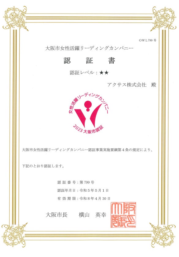 アクサス株式会社(本社:東京都新宿区、代表取締役社長:小堀 一雄、以下アクサス)は、大阪市の実施する「大阪市女性活躍リーディングカンパニー」認証において、二つ星に認証されました。