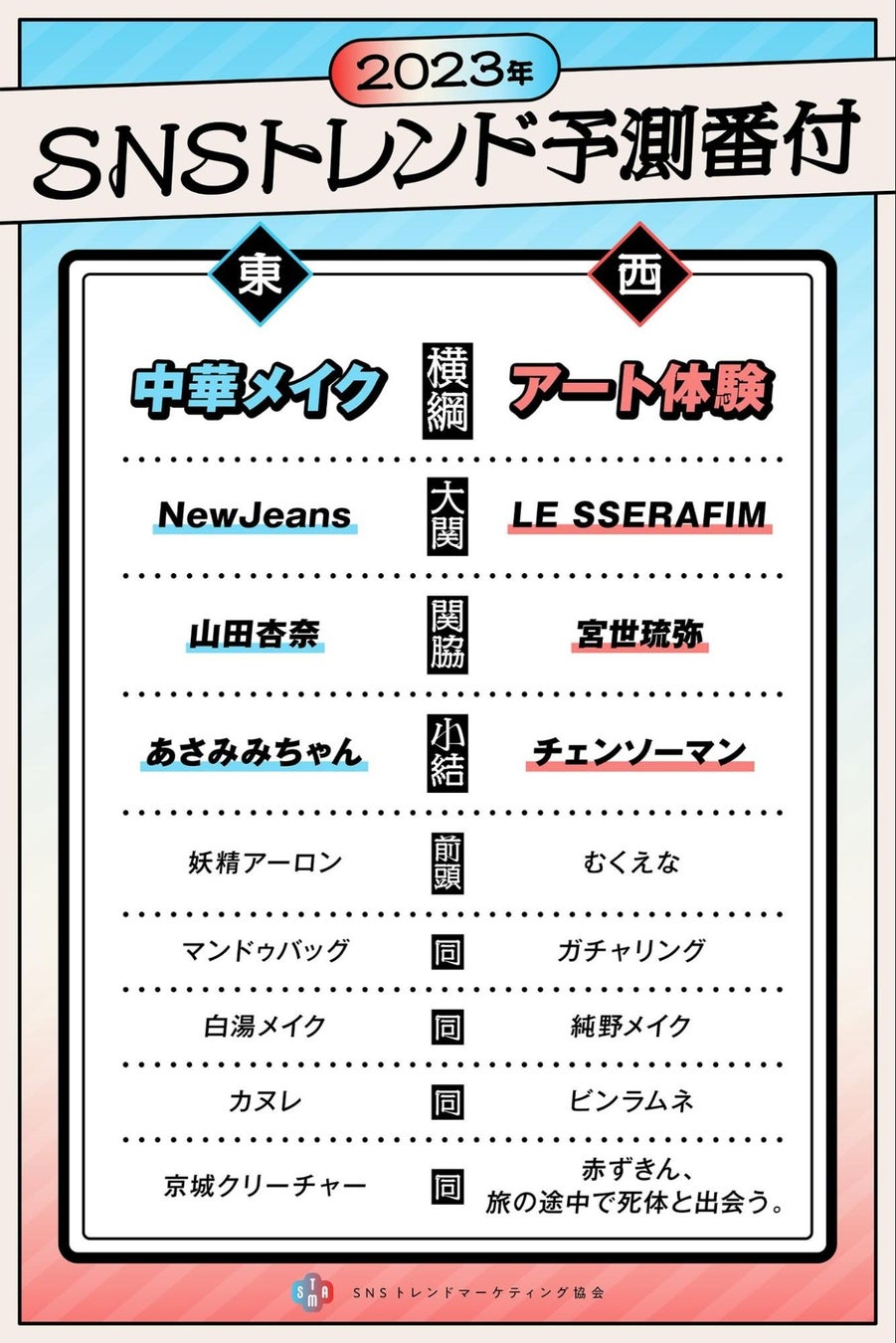一般社団法人SNSトレンドマーケティング協会(代表理事:椎木里佳、本社:東京都千代田区)は、『2023年 SNSトレンド予測番付』を発表したことをお知らせします。