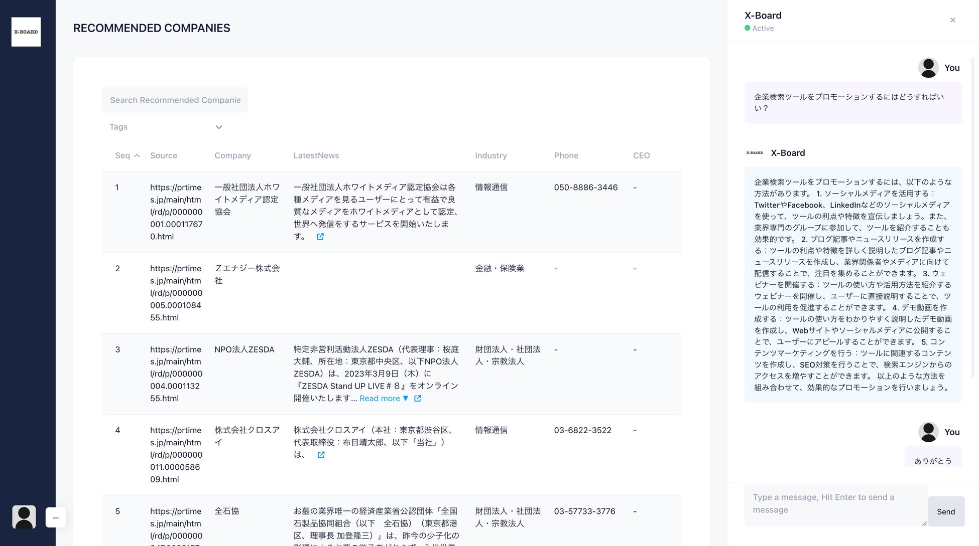 - 「企業レコメンド x ChatGPT」X-Board:https://www.x-board.link/