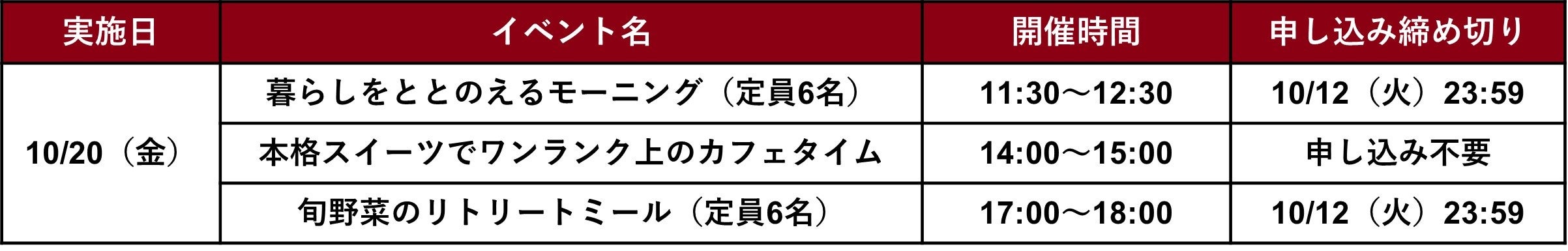 上記の「暮らしをととのえるモーニング」と「旬野菜のリトリートミール」の参加には、専用応募フォームからの予約が必要となります。特設サイトよりご応募ください。