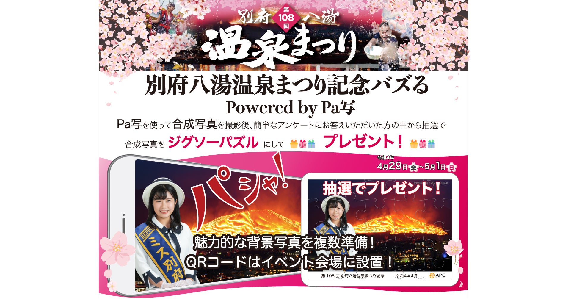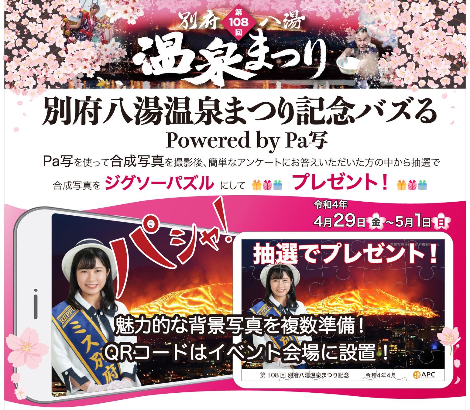株式会社APC(本社:大分市、代表取締役:佐藤 隆己、以下APC)と別府八湯温泉まつり実行委員会(実行委員長:権藤 和雄、以下別府八湯温泉まつり)は連携して、令和4年4月29日から開催予定の「別府八湯温泉まつり」の催し物として、「別府八湯温泉まつり記念バズる」の事業検証を行うことに致しました。