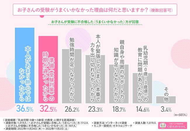 「お子さんの受験がうまくいかなかった理由は何だと思いますか?(複数回答可)」と質問したところ、『本人があまり熱心ではなかったから(36.5%)』 と回答した方が最も多く、次いで『準備(受験対策)の時期が遅かったから(32.5%)』 と続きました。
