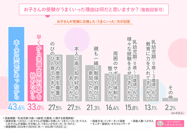 「お子さんの受験がうまくいった理由は何だと思いますか?(複数回答可)」と質問したところ、『本人に熱意があったから(43.6%)』 と回答した方が最も多く、次いで『早くから準備(受験対策)を始めたから(33.0%)』 と続きました。