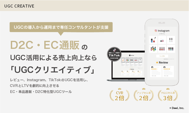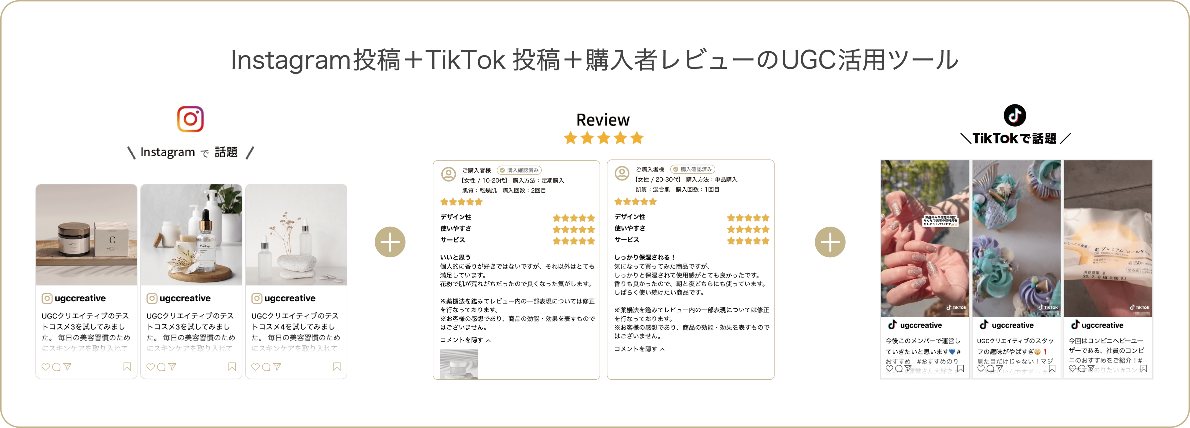 UGCクリエイティブは、「InstagramのUGC(=写真と動画のUGC)」と「TikTokのUGC(=縦型ショート動画のUGC)」と 「レビューのUGC(=★とテキストのUGC)」の3つのUGCを生成→収集→掲載→分析→改善まで一気通貫で自動化させ、高速でUGCの活用⇔改善のPDCAを回すことで、D2C・単品リピート通販・EC企業の売上(新規CV率、引き上げ率、クロスセル率)を劇的に向上させるUGC活用ツールです。