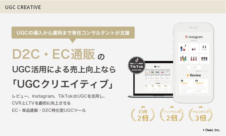 累計300社を超えるD2C・EC・単品通販を支援してきた実績とノウハウをもとに開発されたD2Cの売上(新規CV率、引き上げ率、クロスセル率)を上げるためのEC・単品通販・D2C特化型UGC活用ツールです。
