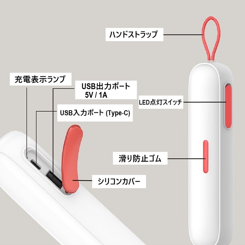 ・外部機器への充電器としても使用可能。(出力ポート形式: Type-A 5V/1A、電池容量3.6Ah)