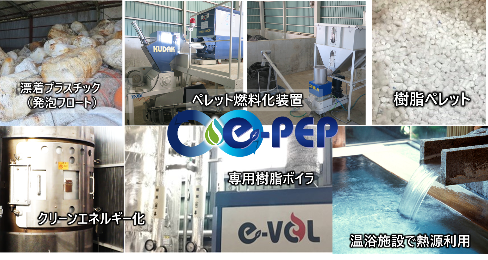 当社では、2007年から関係省庁と連携しながら、日本沿岸に流れつく漂着プラスチックの有効利用に向けて技術開発を行いプラスチックごみを燃料チップやペレットに変えて小型樹脂ボイラで温水や蒸気利用ができる「e-PEPシステム」を開発しました。このシステムは、プラスチックごみの処理や運搬にかかる環境負荷を最小限に抑え、リサイクルのためにエネルギーを消費するのではなく、新たなエネルギーを生み出すことができます。
