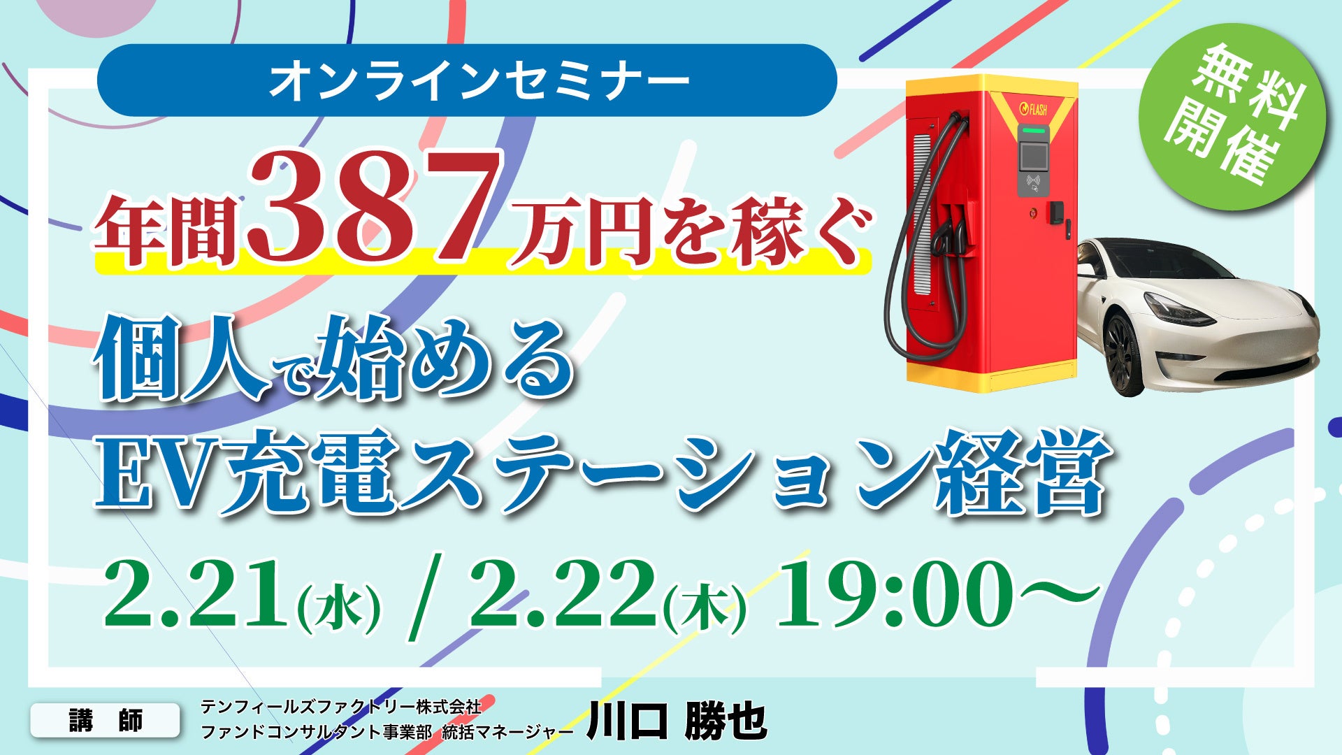 【無料オンラインセミナー】2/21(水),22(木)に年間収益387万円を実現する「個人で始めるEV充電ステーション経営」投資セミナーを開催