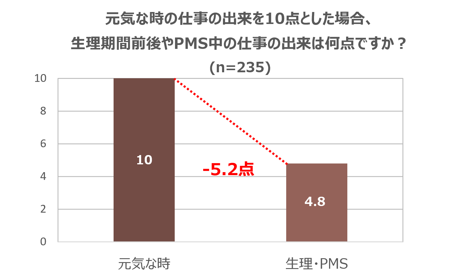 上記グラフは、全国の20代~50代の会社員の女性400名を対象に、女性の仕事と健康支援に関する意識調査を行った結果です。「元気な時の仕事の出来を10点とした場合、生理期間前後やPMS中の仕事の出来は何点ですか」という質問の回答は平均4.8点となり、生理・PMSの影響により、5.2点分も仕事のパフォーマンスが下がるということが判明しました。この結果から、多くの女性が月経・PMSの影響で心身に影響を受け、仕事に支障が出ていることが分かります。