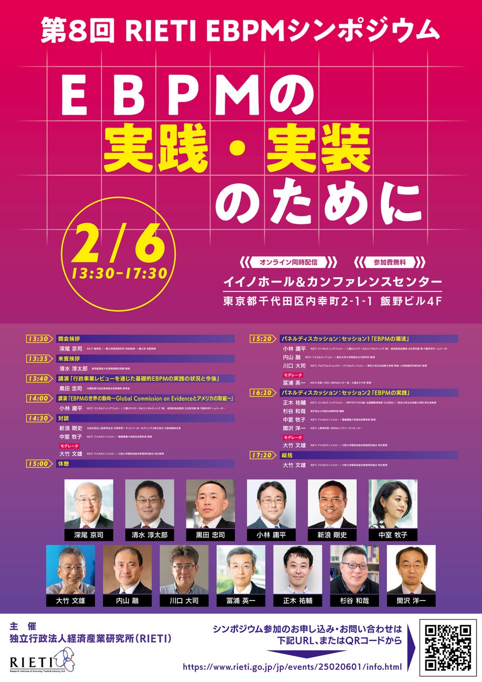 8回目の開催となる今回のRIETI EBPMシンポジウムでは、世界のEBPMの潮流や政府の取組、先進事例等を紹介しつつ、現場の課題や政府データ活用の重要性、経済界からの提言などにつき関係者が一堂に会し議論を行います。