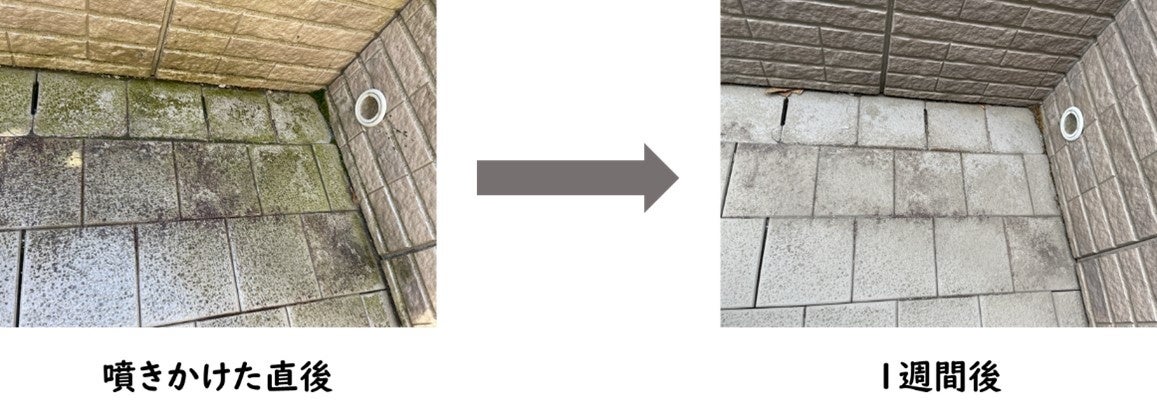 おそとのぴきゃみんの効果について検証を行いました。汚れたタイルに噴きかけたところ、1週間後にコケ汚れが洗浄されていることを確認しました。