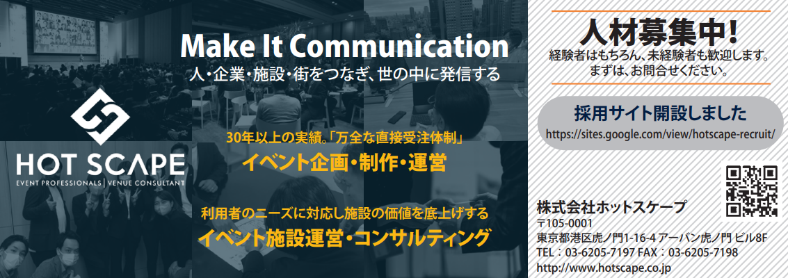 株式会社ホットスケープ(東京都港区、代表取締役: 前野伸幸)は、創業以来「万全な直接受注体制」のもと、ビジネスイベントを中心に企画・制作・運営を行ない、現在はその実績を活かし、施設の管理・運営やプロジェクトコンサルティングなど、事業の幅を拡大しています。