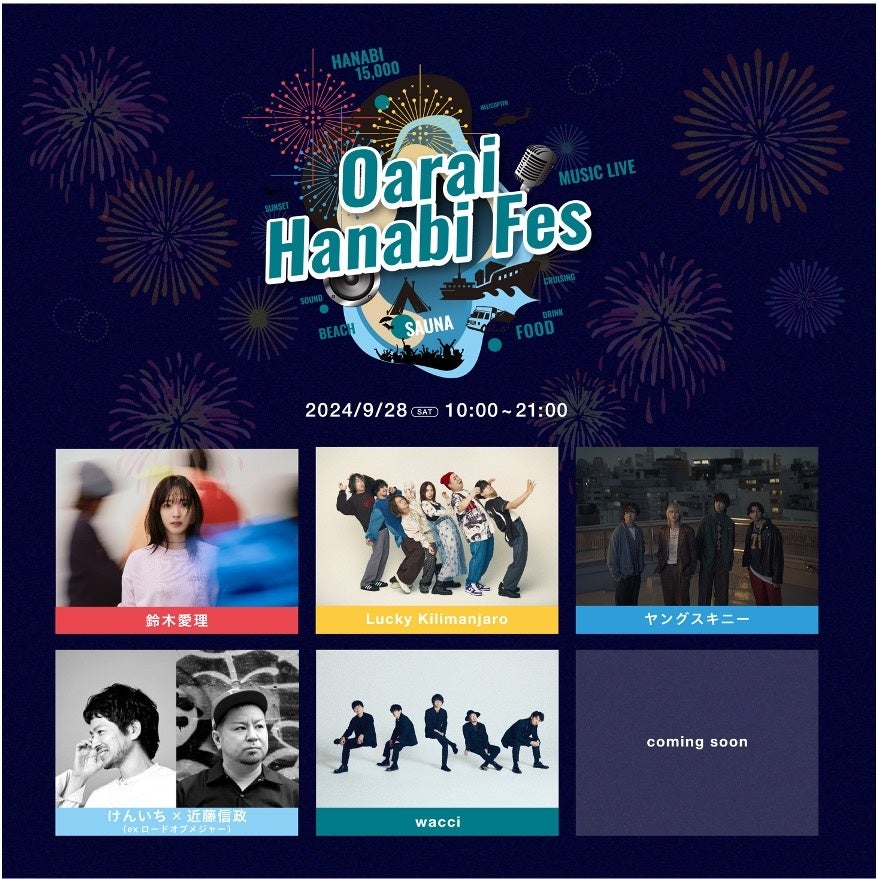 第3回『大洗海上火大会~OARAI HANABI FES~』は、歴史ある大洗海上花火大会に有料席を設けふるさと納税の返戻品として花火やライブを楽しんで頂くだけでなく、サウナフェス、フードフェスの体験もできる複合フェスです。2023年の前回大会は、約12,000発の花火に加え、 RIP SLYME様 / KREVA様 / SPYAIR様 / SCANDAL様 / Tani Yuuki様 / JP THE WAVY様 / FRUITS ZIPPER 様/ asmi様 / けんいち×近藤信政(exロードオブメジャー) 様/ ばんばんざい様 / tonun様 / MASK OF GODDESS様などの豪華アーティストによるライブがおこなわれました。