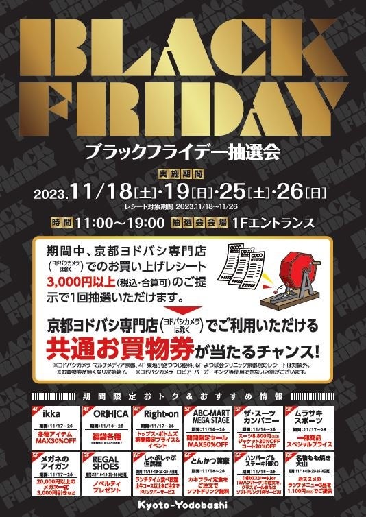 また、2023年11月18日(土)、11月19日(日)、11月25日(土)、11月26日(日)の4日間限定で、2023年11月18日(土)~11月26日(日)の期間中に京都ヨドバシ専門店にてお買上げいただいたレシート3,000円以上(税込・合算可)で参加可能な、ブラックフライデー抽選会も開催します。