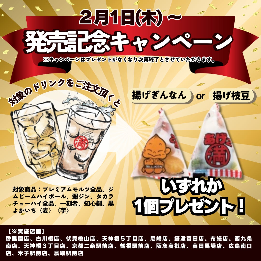 多くの人に「あげ2満」を味わって頂きたい!という思いから、発売と同時に対象ドリンクをご注文いただくと〈揚げぎんなん・枝豆〉のうちどちらかをお試し頂けるキャンペーンを開催いたします。2杯頼んで両方味わっても、複数で頼んで分け合っても、楽しんで頂けますよ!