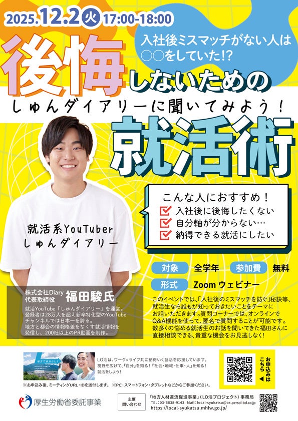 パーソルビジネスプロセスデザイン株式会社(本社: 東京都港区芝浦3丁目4-1、代表取締役社長: 市村 和幸)は、厚生労働省より受託している「地方人材還流促進事業(LO活プロジェクト)」において、2025年12月2日(火)17時より、オンラインイベント「しゅんダイアリーに聞いてみよう!後悔しないための就活術」を開催します。ゲストにYouTube「しゅんダイアリー就活チャンネル」を運営する福田駿氏を迎え、就活生が抱える不安や悩みに寄り添いながら、入社後のミスマッチを防ぐ秘訣等、就活に役立つヒントを提供します。