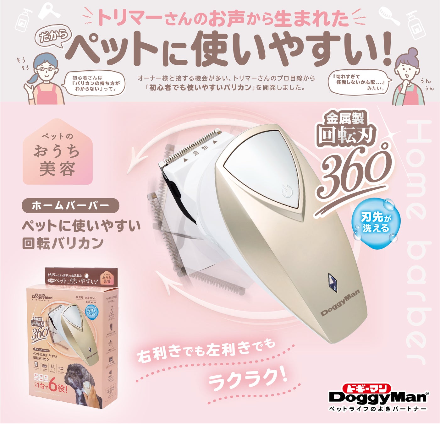ペットのトリミングに欠かせないバリカン。しかし、バリカンの持ち方が分からない、切れすぎて怪我しないか心配などの問題がありました。そこで、トリマーさんたちからの声を取り入れ、より使いやすく、ペットの毛並みに合わせてカットできるバリカン、「ホームバーバー ペットに使いやすい回転バリカン」を完成いたしました。