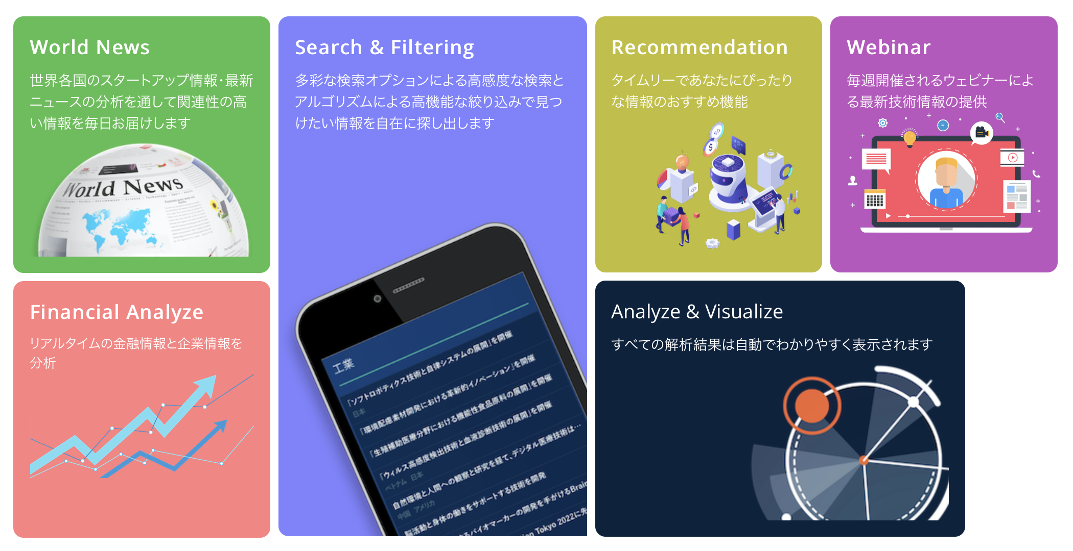 最新の企業動向解析を通じて、スタートアップ発掘、新技術・事業発掘、アライアンスまでを一気通貫で実現