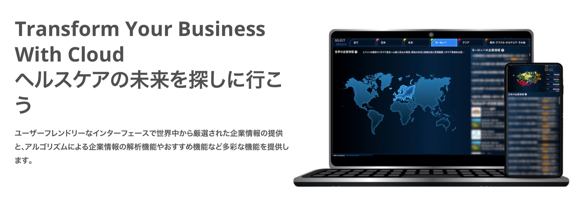 デジタル✕ヘルスケア領域で最大規模のデータベースから、地域別にAIが分析した最適な技術・事業情報を抽出します。