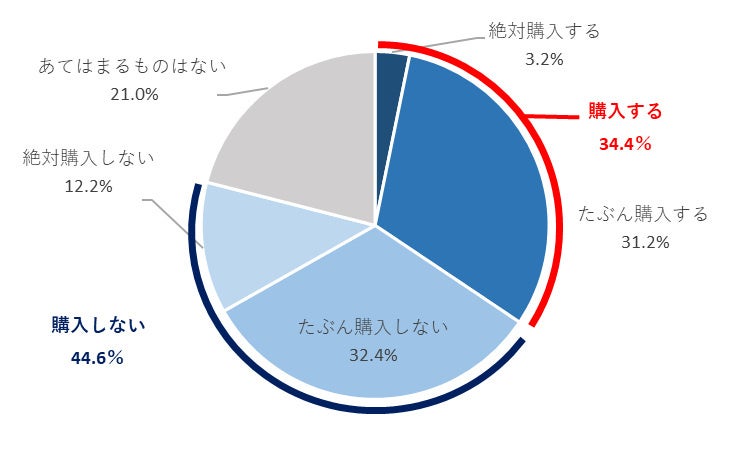 今回、災害等への寄付の方法として、購入代金の一部を義援金として寄付できる商品に注目しました。寄付できることを理由にその商品を購入するかを聞いたところ、約3割の人が「購入する(「絶対購入する」+「たぶん購入する」)」 (34.4%)と回答しました。一方で、「購入しない(「たぶん購入しない」+「絶対購入しない」)」と回答した人は4割を超え(44.6%)、「購入する」を約10ポイントも上回る結果となりました。