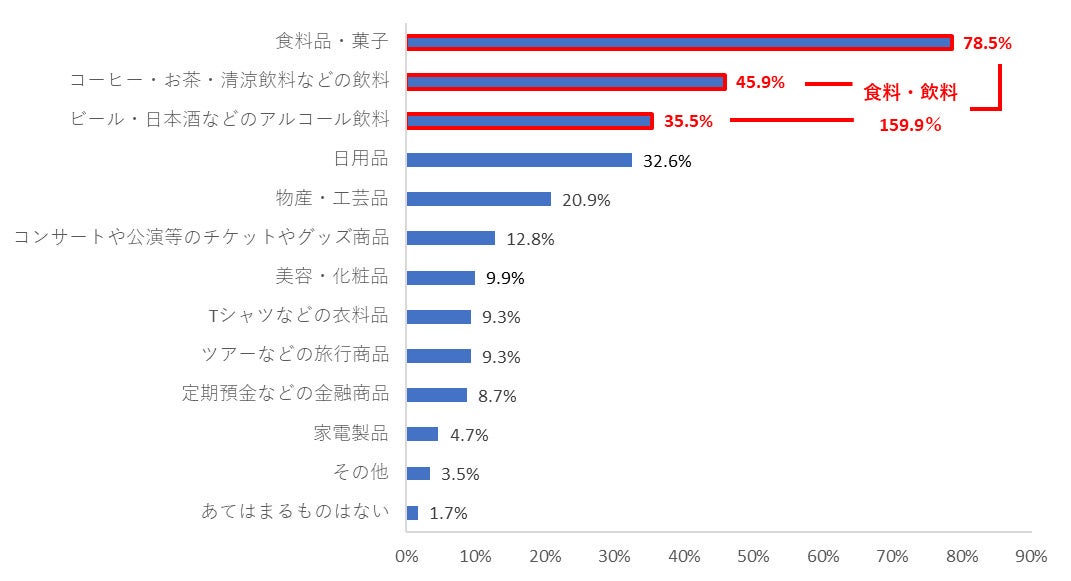 購入代金の一部を義援金として寄付できる商品を「購入する」と回答した人に、購入したいと思う商品について聞いたところ、1位は「食料品・菓子」で78.5%に達しました。2位は「コーヒー・お茶・清涼飲料などの飲料」(45.9%)、3位は「ビール・日本酒などのアルコール飲料」(35.5%)と、日々の生活において必需品である食料・飲料がトップ3に挙がりました。4位以下は、「日用品」(37.6%)、「物産・工芸品」(9.9%)、「コンサートや公演等のチケットやグッズ商品」(12.8%)と続いています。