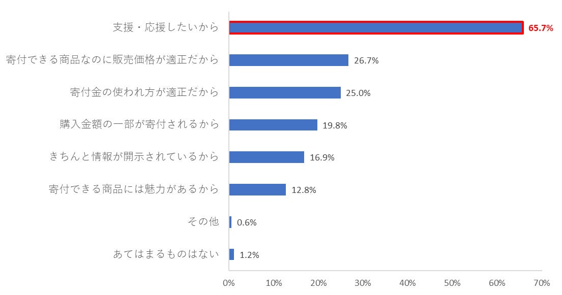 購入代金の一部を義援金として寄付できる商品を「購入する」と回答した人に、その理由を聞くと、「支援・応援したいから」が65.7%に達し、ダントツの1位となりました。被災地を支援・応援したいという想いから商品を購入する人が多いことがわかりました。2位以下は、「寄付できる商品なのに販売価格が適正だから」(26.7%)、「寄付金の使われ方が適正だから」(25.0%)、「購入金額の一部が寄付されるから」(19.8%)となっています。