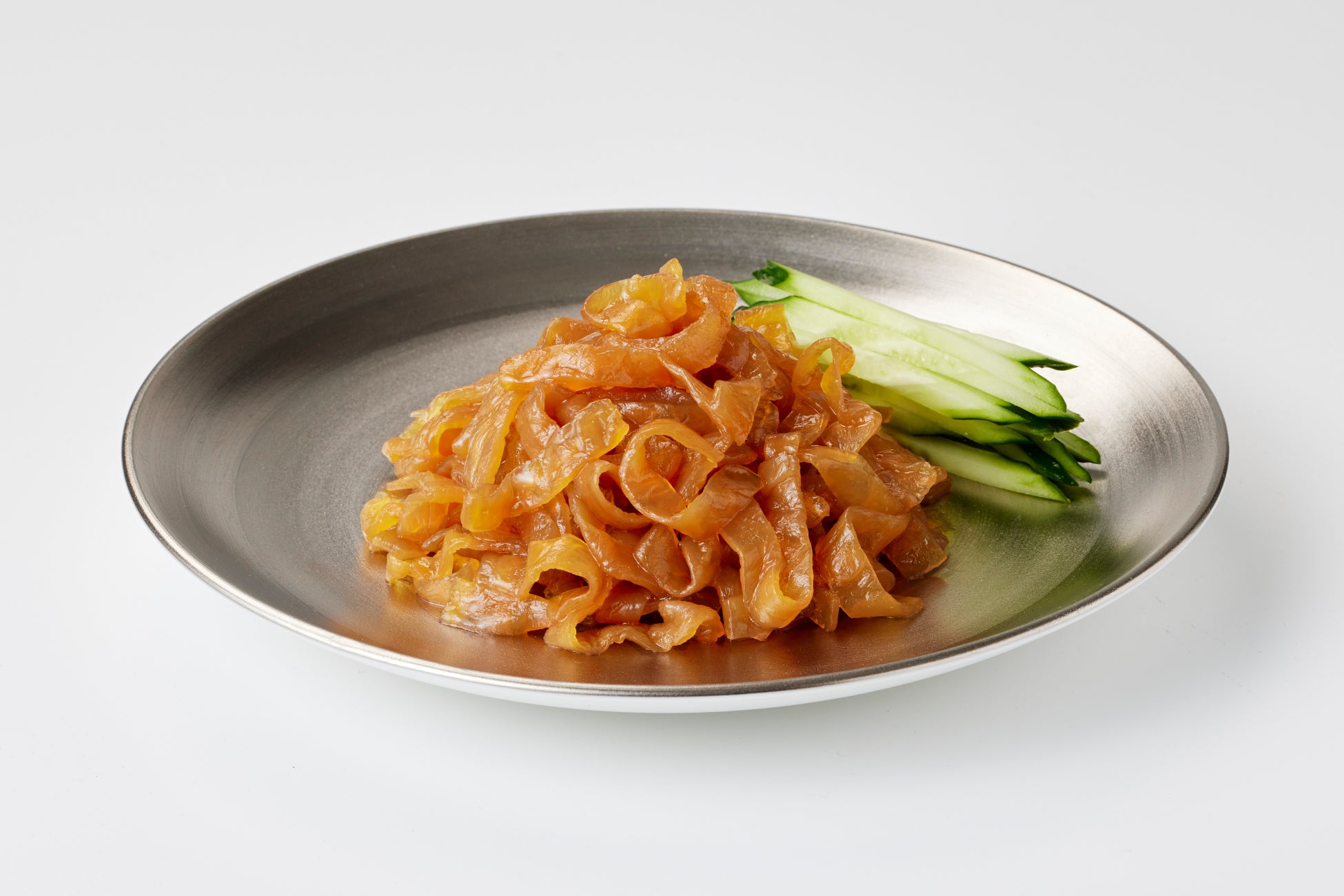 くらげの独特なコリコリとした食感と、さっぱりとした味わいが人気の一品。直営のデパ地下店舗でもリピーターのお客様が多いメニューです。醤油、酢、上白糖、ごま油などをブレンドした自家製調味液に漬けこみ、仕上げにほんの少しマスタードを利かせました。