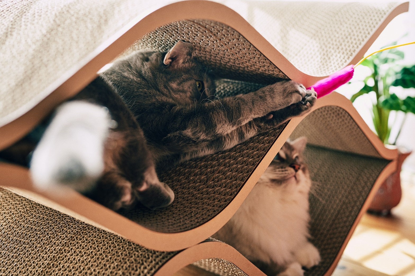 本体は強化段ボール製で猫の爪研ぎとして長期的に使用でき、内部のトンネル部分は猫が安らぎを得られる隠れ家として、上部の曲面は猫の体にフィットしてお昼寝にも最適です。