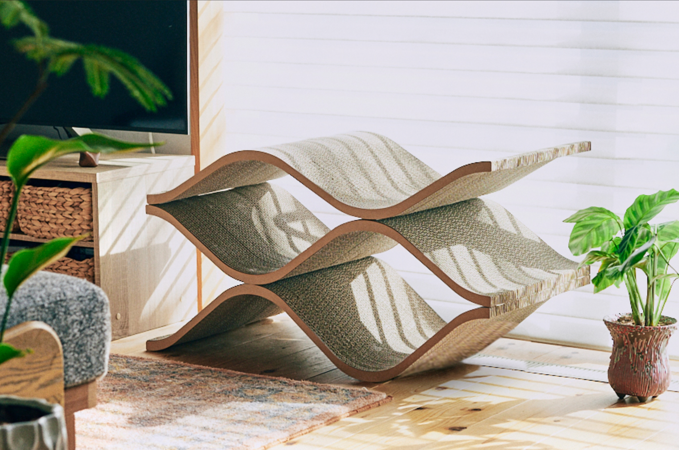 本製品は、猫の飼い主の多くが抱える「猫グッズがインテリアに馴染まない」という悩みに着目。デザインの専門家である建築家 平林航一と猫の専門家である獣医にゃんとす(@nyantostos)が設計と監修を行うことで誕生した猫用家具です。カミカグの段ボール造形技術を活かすことで、インテリアに馴染む美しさを持ちながら、猫の体に馴染む形状を実現しました。