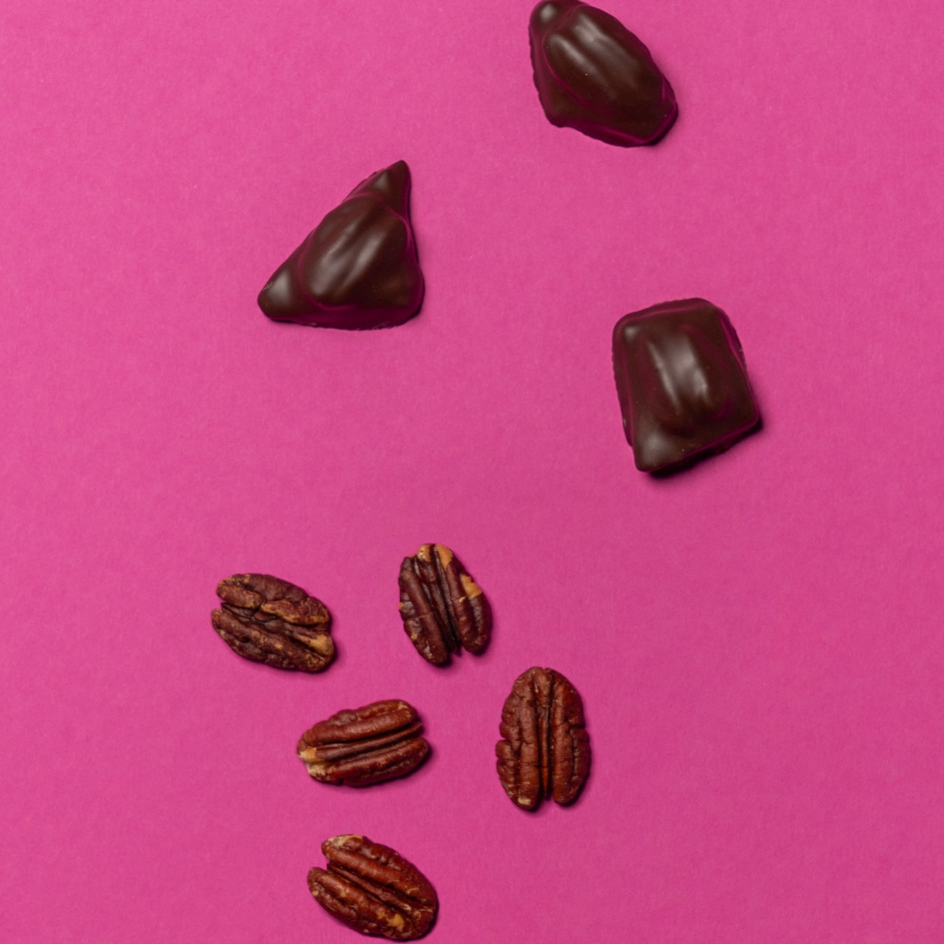 薄いキャラメルの層の上に、軽く塩味を付けたローストピーカンナッツを散りばめ、ニカラグア産のダークチョコレートでコーティング。香ばしいピーカンナッツと、甘くて食感が楽しいキャラメルの幾重にも重なる味わいをお楽しみください。