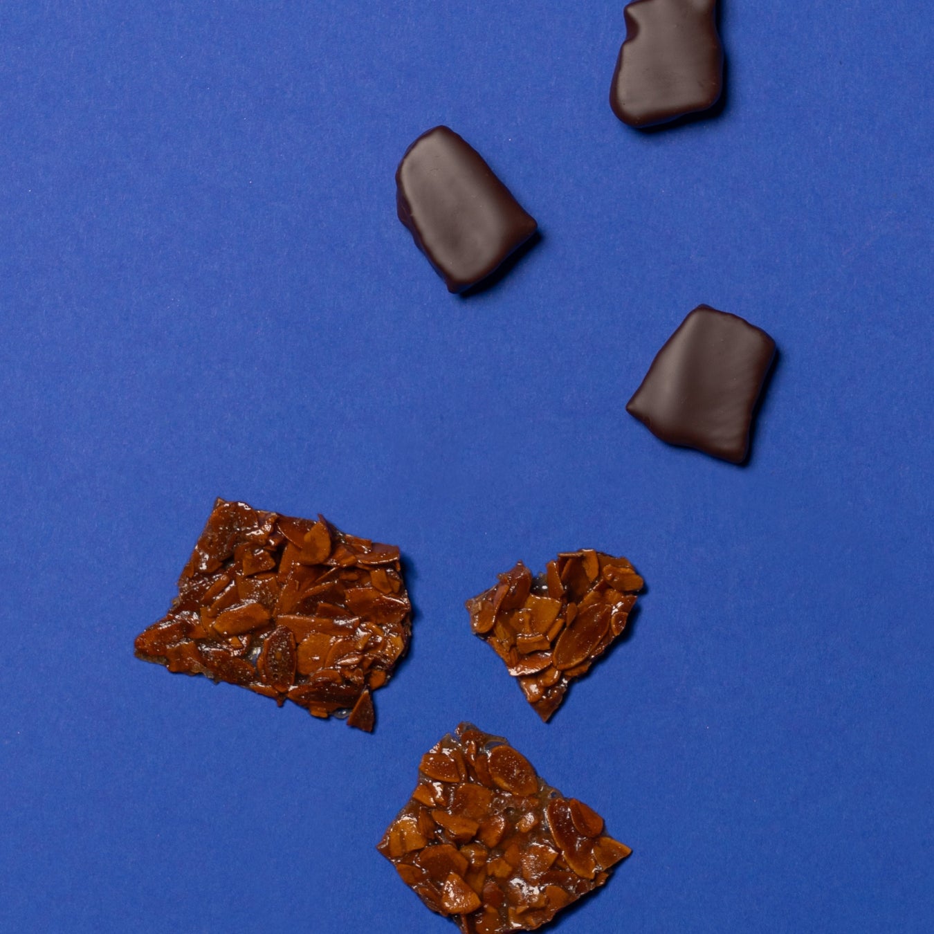 薄くスライスしたアーモンドをキャラメリゼし、ニカラグア産チョコレートでコーティングしました。一口かじると、カリカリとしたアーモンドと、チューイーなキャラメルが織りなすハーモニーがクセになります。