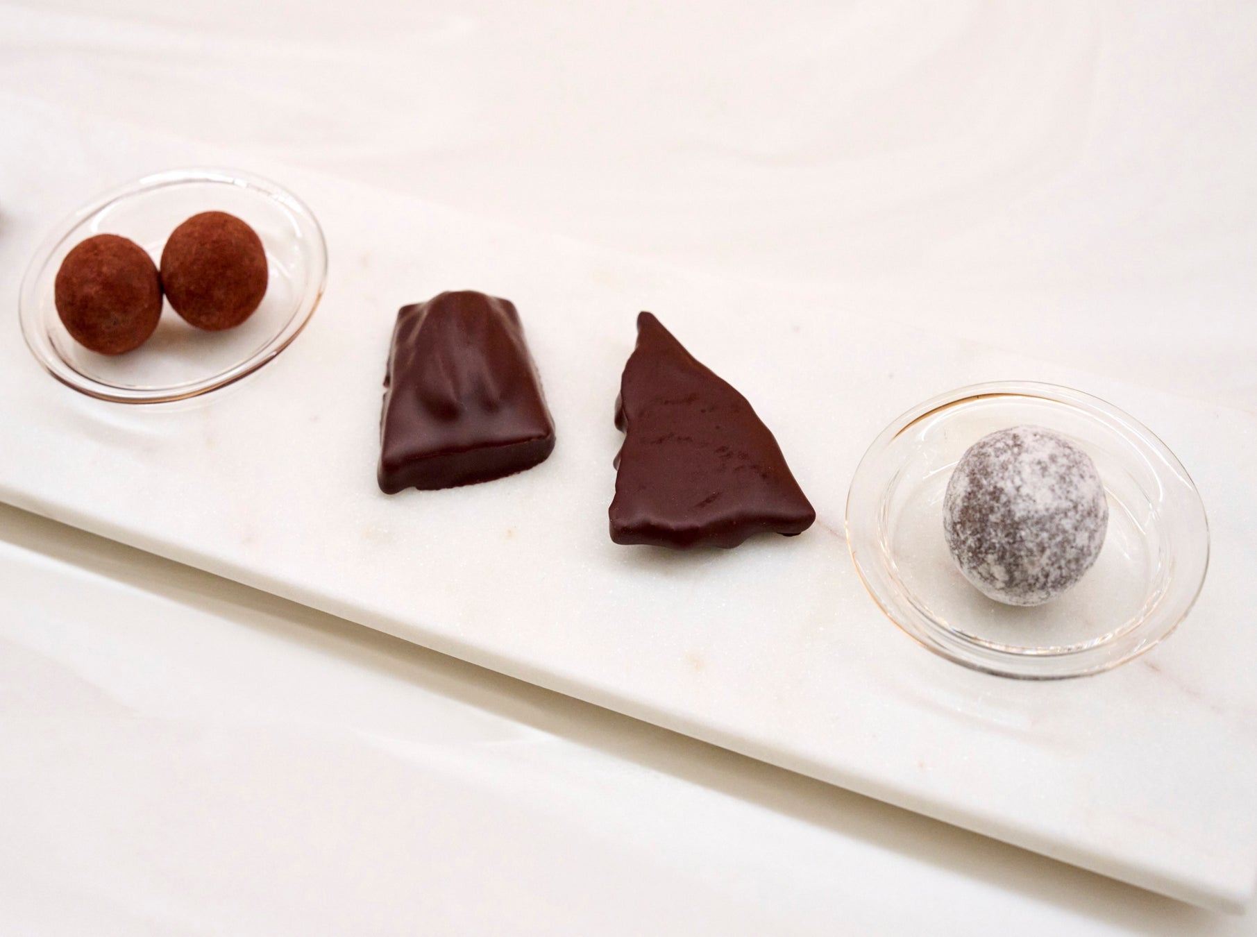 (右画像)(左より)「キャラメル サレ トリュフ」、「ピーカン ブリトール」、「アーモンド ブリトール」、「シャンパン トリュフ」