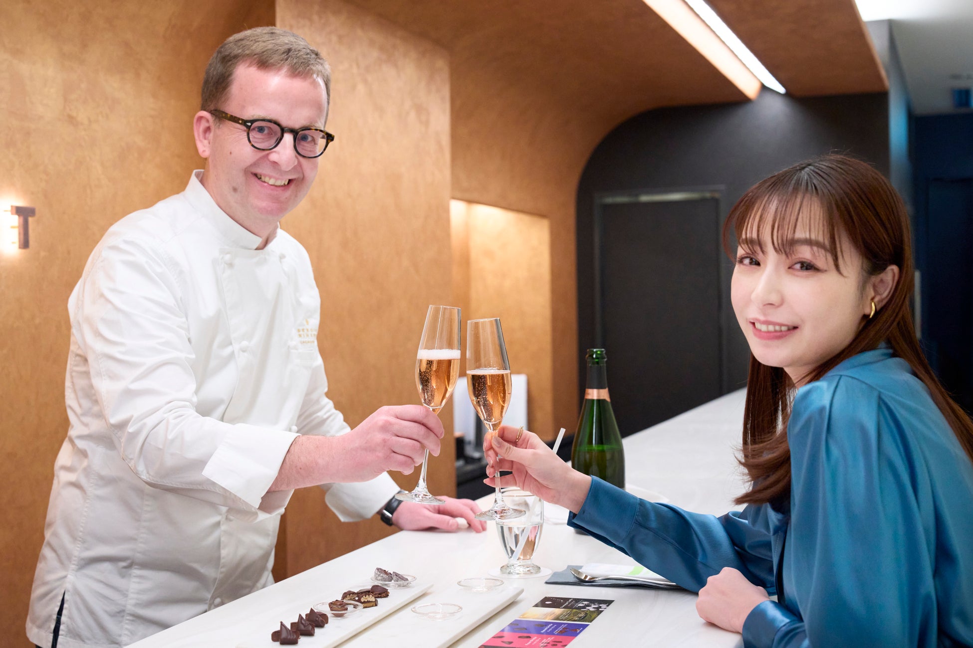 最後にシャンパン トリュフを試食。ブノワ氏は、「自分の理想とするシャンパン トリュフの味を実現するために、数ある中からフランス北東部のシャンパーニュ地方で生産されるシャンパン“ポール・グール”を使用しました。特にロゼが自分のカカオの味わいを引き立たせてくれます。生産者と話を重ねてレシピ開発を行いました。」と、開発当時のエピソードを情熱的に語りました。試食した宇垣さんは、「一口かんだ瞬間に、華やかなシャンパン独特の開いた香りを感じました。すごくノーブル(崇高)な気持ちになりました。」と、ご満悦なご様子でした。