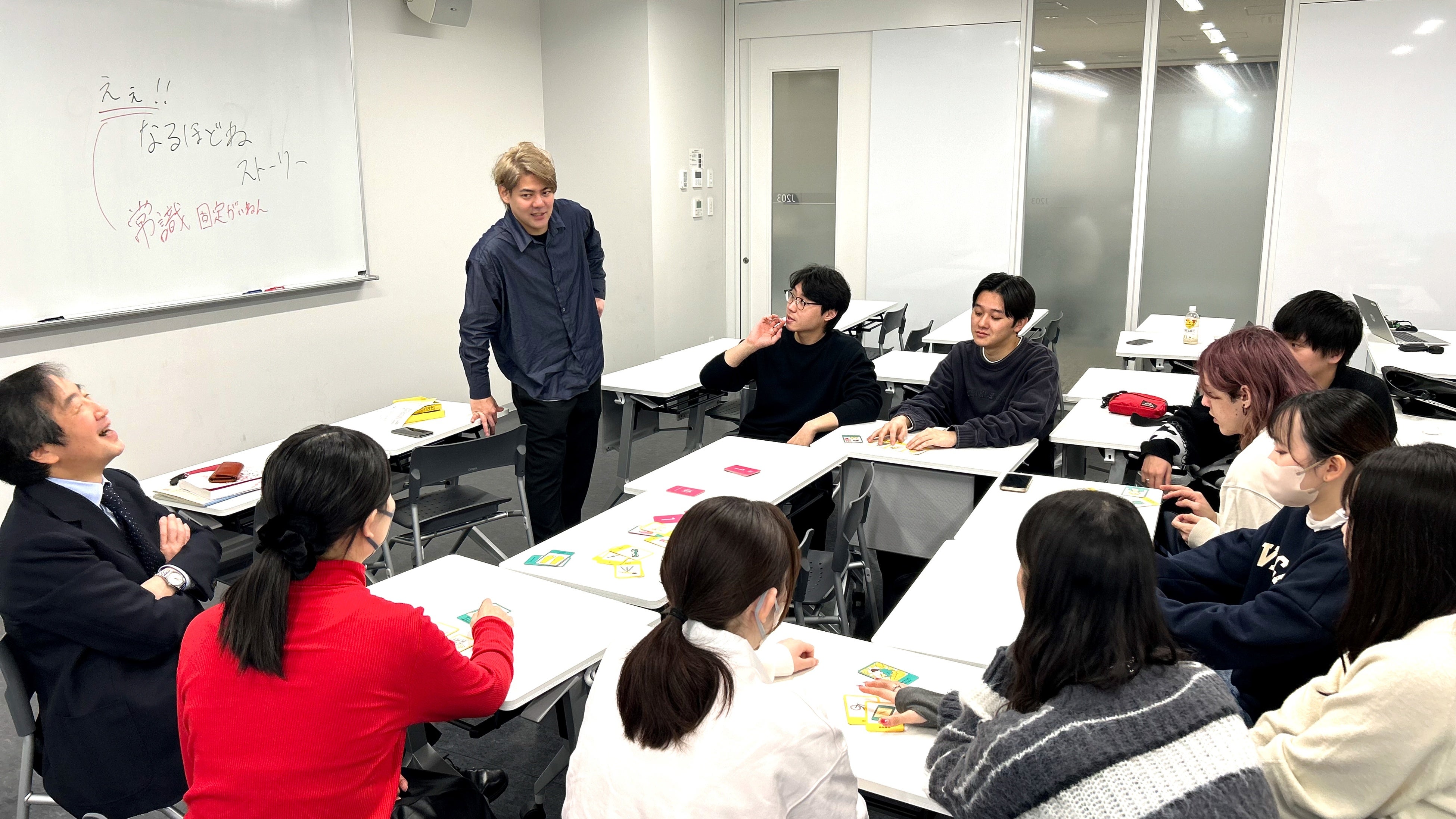 ゲームを取り入れながら、和やかに談笑する講義の一場面。