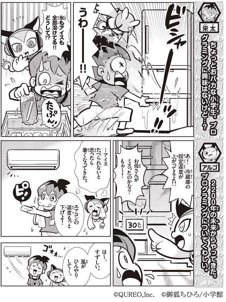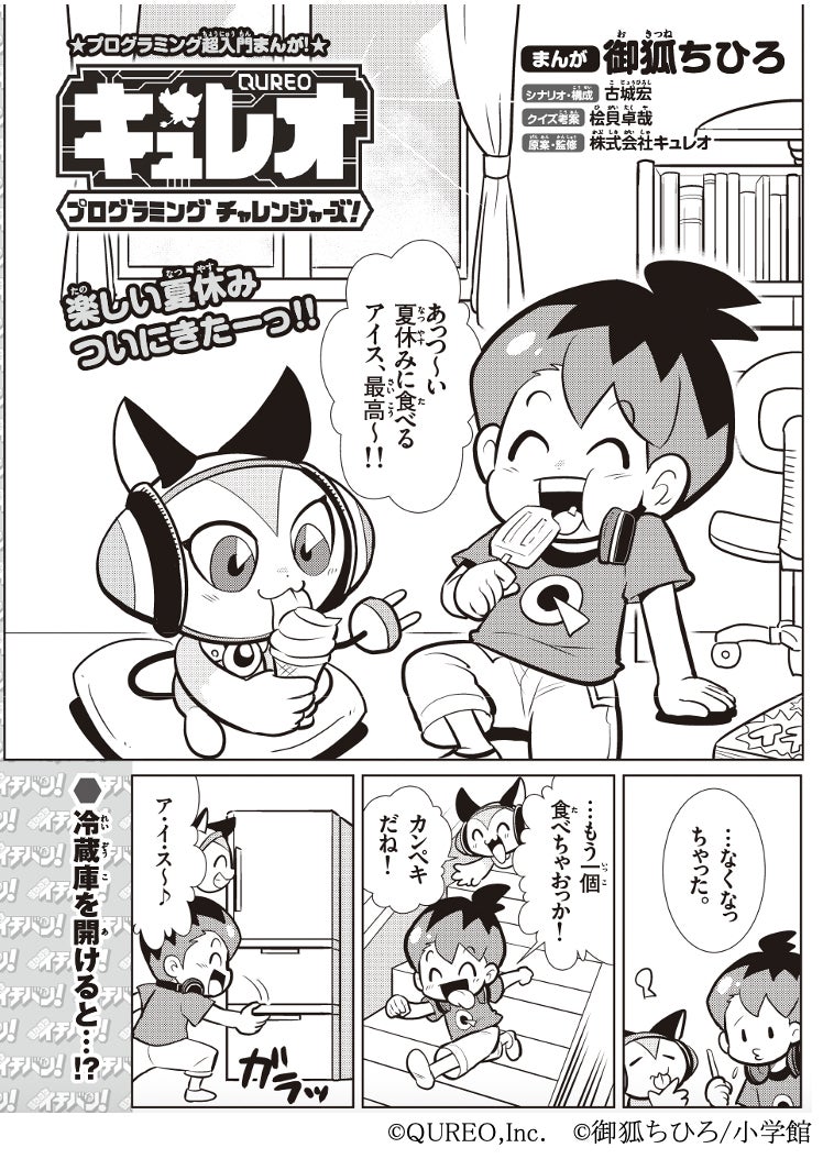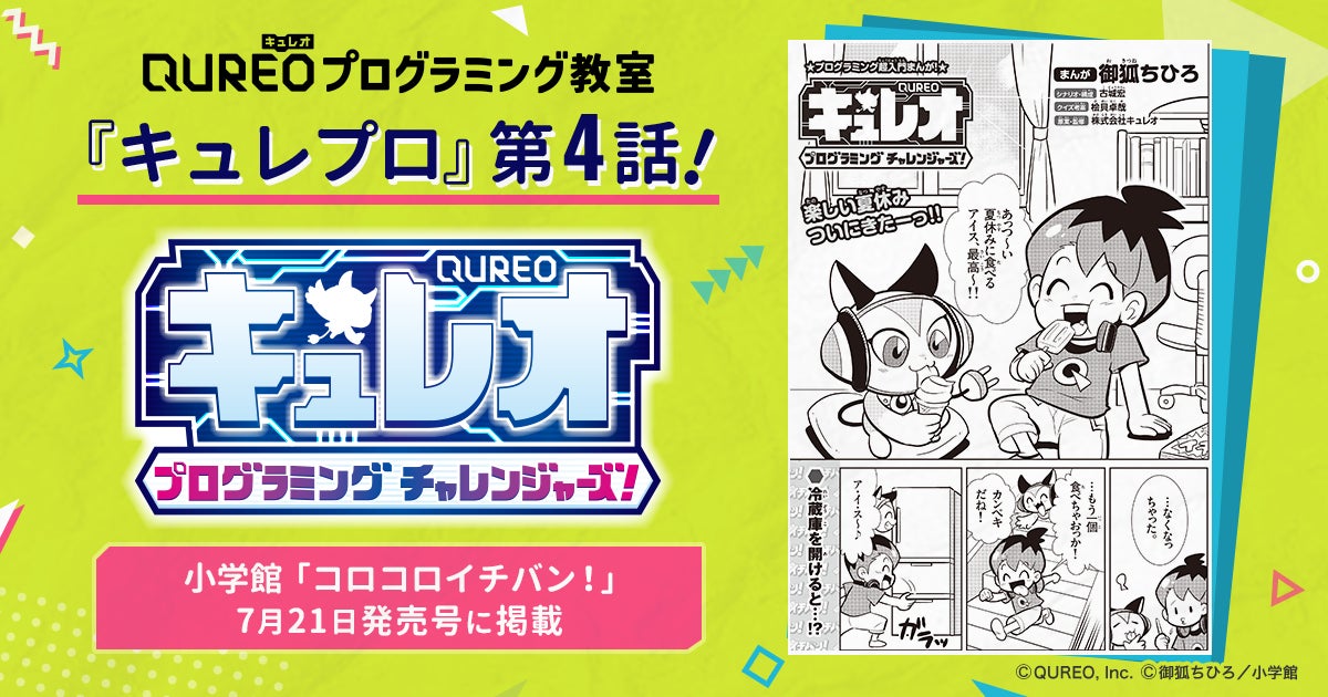 株式会社CA Tech Kidsと株式会社スプリックスとの合弁会社で、プログラミング教材の開発・運営・販売事業を行う株式会社キュレオ(本社:東京都渋谷区、代表取締役社長:上野朝大)は、運営する子ども向けプログラミング教室「QUREO(キュレオ)プログラミング教室」 https://qureo.jp/が全面監修するプログラミング学習マンガ『キュレオ プログラミングチャレンジャーズ!(通称:キュレプロ)』の最新回となる第4話の内容をお知らせいたします。第4話が掲載される、小学館「コロコロイチバン!」7月21日発売号の本誌ページの一部も公開いたします。