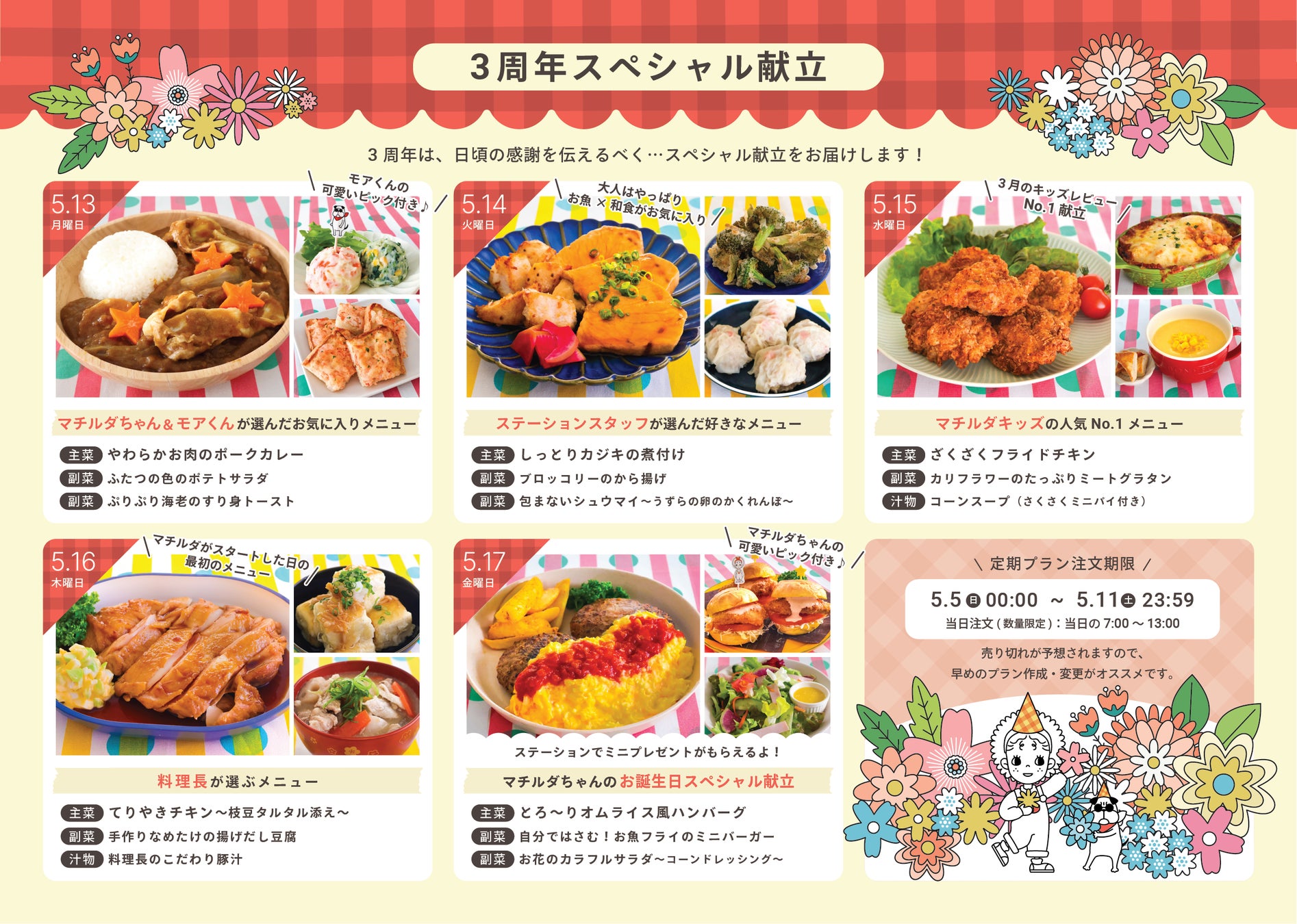 家庭料理テイクアウトの「マチルダ」、提供開始3周年を記念し、子どもたちの人気No.1メニューなど特別な献立をお届けします!