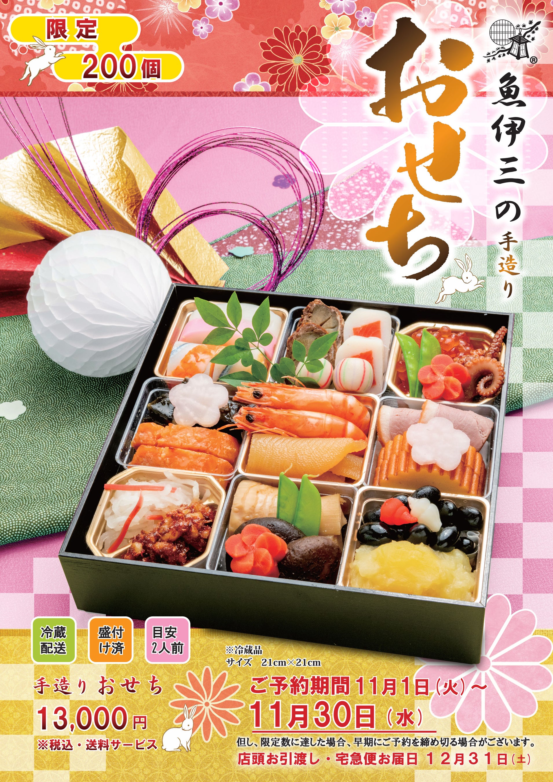 創業80年、冠婚葬祭仕出し専門店の魚伊三株式会社(本社:東京都練馬区、代表:小美濃 友一)は、2022年11月1日(火)より限定200個の手造り“生おせち”の予約を開始いたします。