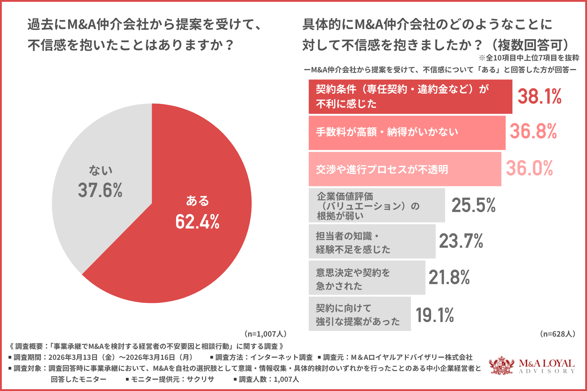 そこで、「過去にM&A仲介会社から提案を受けて、不信感を抱いたことはあるか」と尋ねたところ、約6割が『ある(62.4%)』と回答しました。