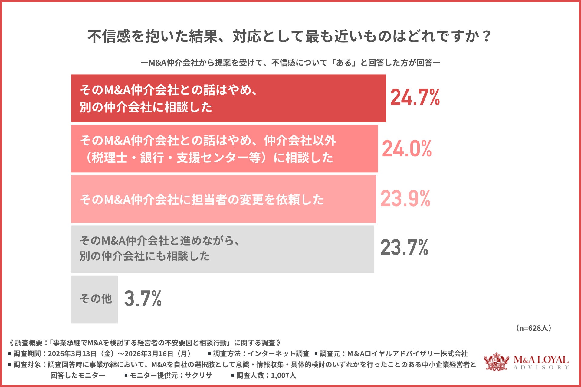 「不信感を抱いた結果、対応として最も近いもの」を尋ねたところ、『そのM&A仲介会社との話はやめ、別の仲介会社に相談した(24.7%)』と回答した方が最も多く、『そのM&A仲介会社との話はやめ、仲介会社以外(税理士・銀行・支援センター等)に相談した(24.0%)』『そのM&A仲介会社に担当者の変更を依頼した(23.9%)』となりました。