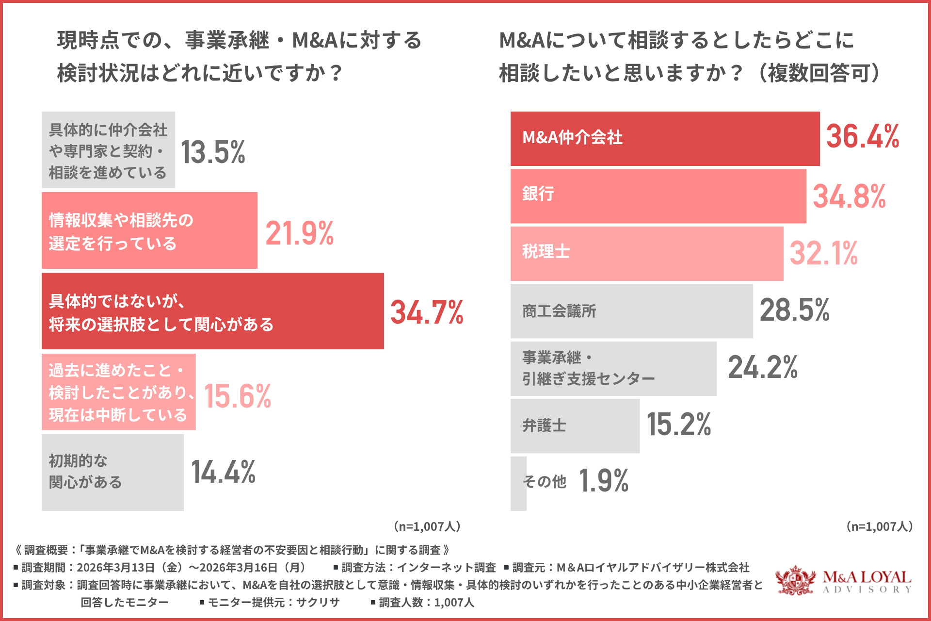 M&Aロイヤルアドバイザリー株式会社(本社所在地:東京都千代田区、代表取締役社長:橋場 涼)は、事業承継において、M&Aを自社の選択肢として意識・情報収集・具体的検討のいずれかを行ったことのある中小企業経営者を対象に、「事業承継でM&Aを検討する経営者の不安要因と相談行動」に関する調査を行いました。
