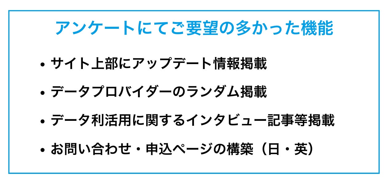 JADAAオルタナティブデータカタログ公開後である2025年2月1日から2025年3月31日まで実証実験期間とし、本取り組みへの評価および機能拡充に向けたアンケートの実施をいたしました。アンケートおよびヒアリングの結果、データカタログサイトに満足している方は90%以上、データカタログサイトの運営を継続してほしいと回答した方は100%となり、データカタログサイトの運営を継続する運びとなりました。一方で、アップデート情報の掲載やインタビュー記事掲載などの機能拡充に関する要望が多く寄せられていることから、2026年3月末まで実証実験期間を延長し順次実装を行ってまいります。
