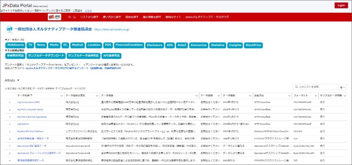 この度、一般社団法人オルタナティブデータ推進協議会(所在地:東京都中央区、代表理事:東海林 正賢、以下本協議会)は、日本システム技術株式会社(所在地:大阪市北区、代表取締役社長:平林 武昭、以下JAST)および株式会社JPX総研(所在地:東京都中央区、代表取締役社長:二木 聡、以下JPX総研)の協力のもと実証実験を実施しておりました「JADAAオルタナティブデータカタログ」につきまして、実証実験期間を延長し、更なる機能拡充に取り組むことをお知らせいたします。