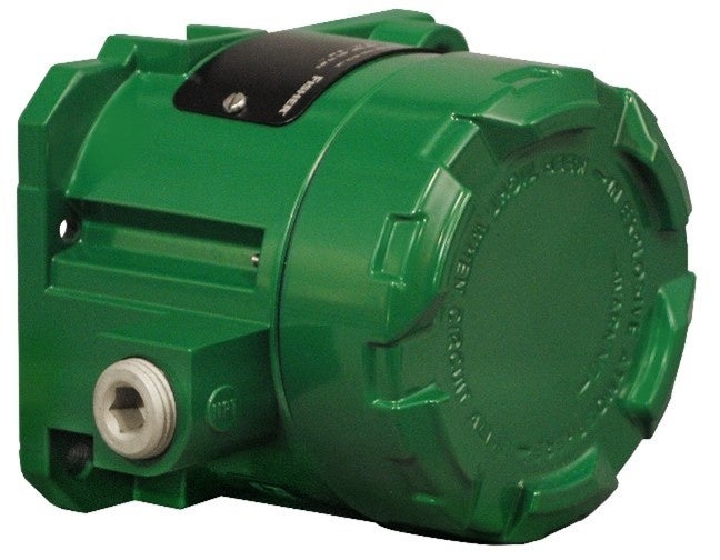 Fisher 4400 バルブ・ポジショントランスミッタ (緑色のデバイス) は、豊富な診断データを提供しながら継続的にバルブ・ポジションを送信するため、ポジションスイッチよりもはるかに高いレベルの信頼性を実現します。