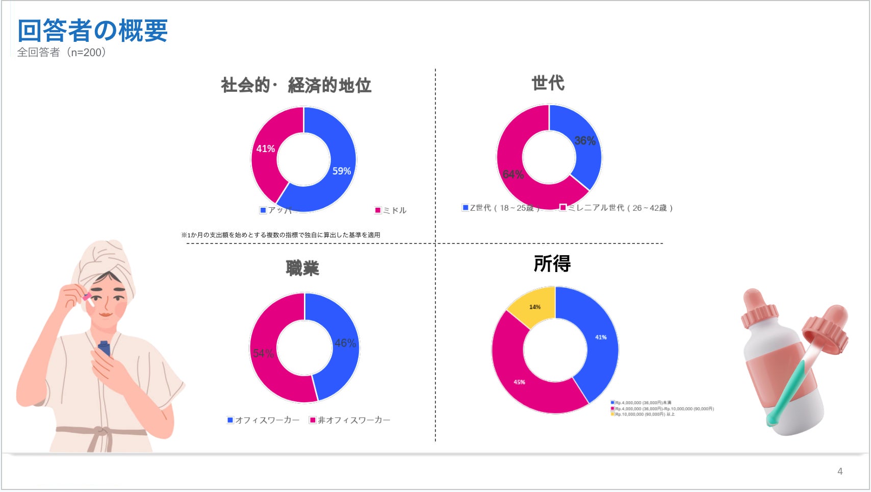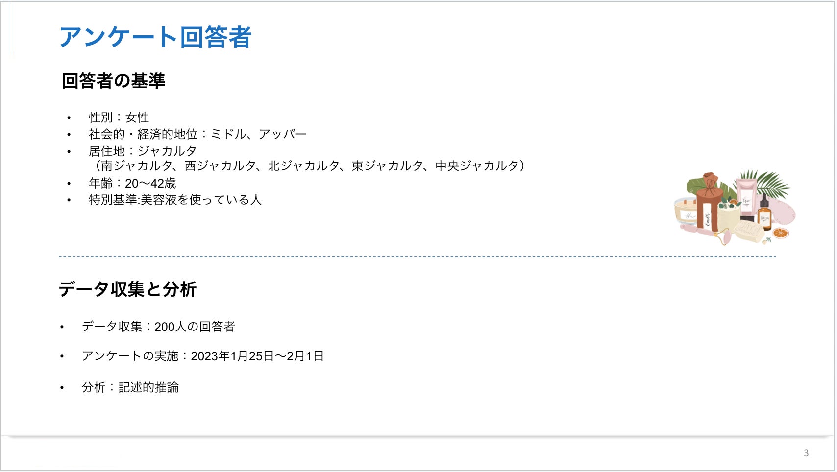 今回は、上記の状況を踏まえて、インドネシア人女性のスキンケアの習慣やどのようなスキンケア製品が求められているかなど、アンケート調査によってより詳しく明らかにしていきました。