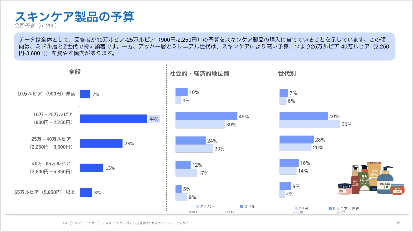 900〜2,250円をスキンケアにかけるのはミドル層とZ世代において顕著なことが判明しました。また、アッパー層とミレニアム世代はスキンケアにより高い予算(2,250〜3,600円)を支払う傾向にあることが明らかになりました。