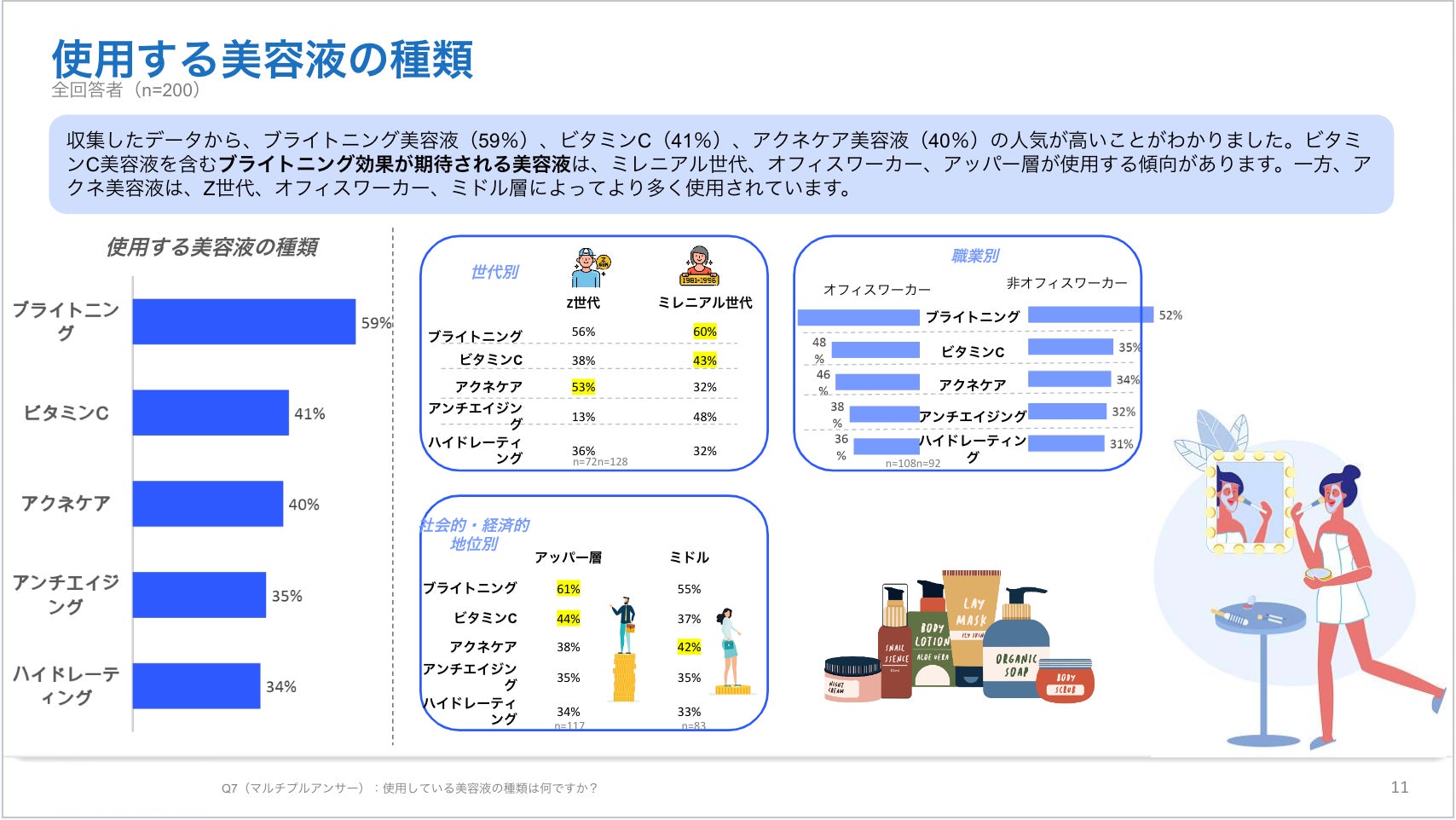 収集したデータによると、ブライトニング美容液(59%)、ビタミンC(41%)、アクネケア美容液(40%)が人気だということがわかりました。ビタミンC美容液を含むブライトニング効果が期待される美容液は、ミレニアル世代、オフィスワーカー、アッパー層が使用する傾向にあります。また、アクネ美容液はZ世代、オフィスワーカー、ミドル層によってより多く使用されています。