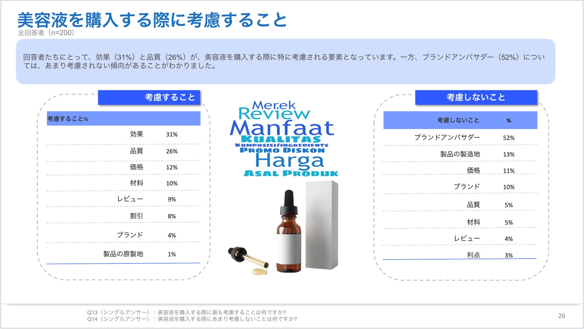 回答者たちによると、効果(31%)と品質(26%)が美容液を購入する際に考慮される要素となっています。一方で、考慮しない要素としてブランドアンバサダー(52%)や製品の製造地(13%)が挙げられました。