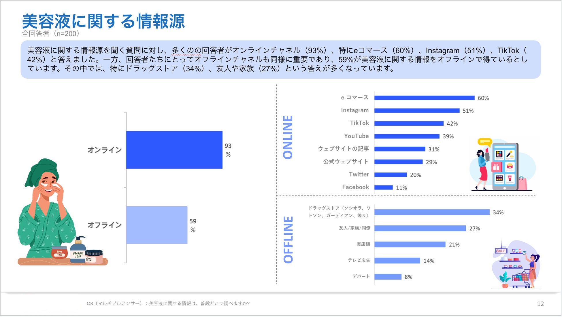 美容液に関する情報はオンラインチャンネルで収集(93%)していることが判明しました。そのなかでもeコマース(60%)、Instagram(51%)、TikTok(42%)が収集源として上位に上がりました。また、オフラインチャネルで収集(59%)も重要視されており、ドラッグストア(34%)、友人や家族(27%)が情報源のトップに入っています。