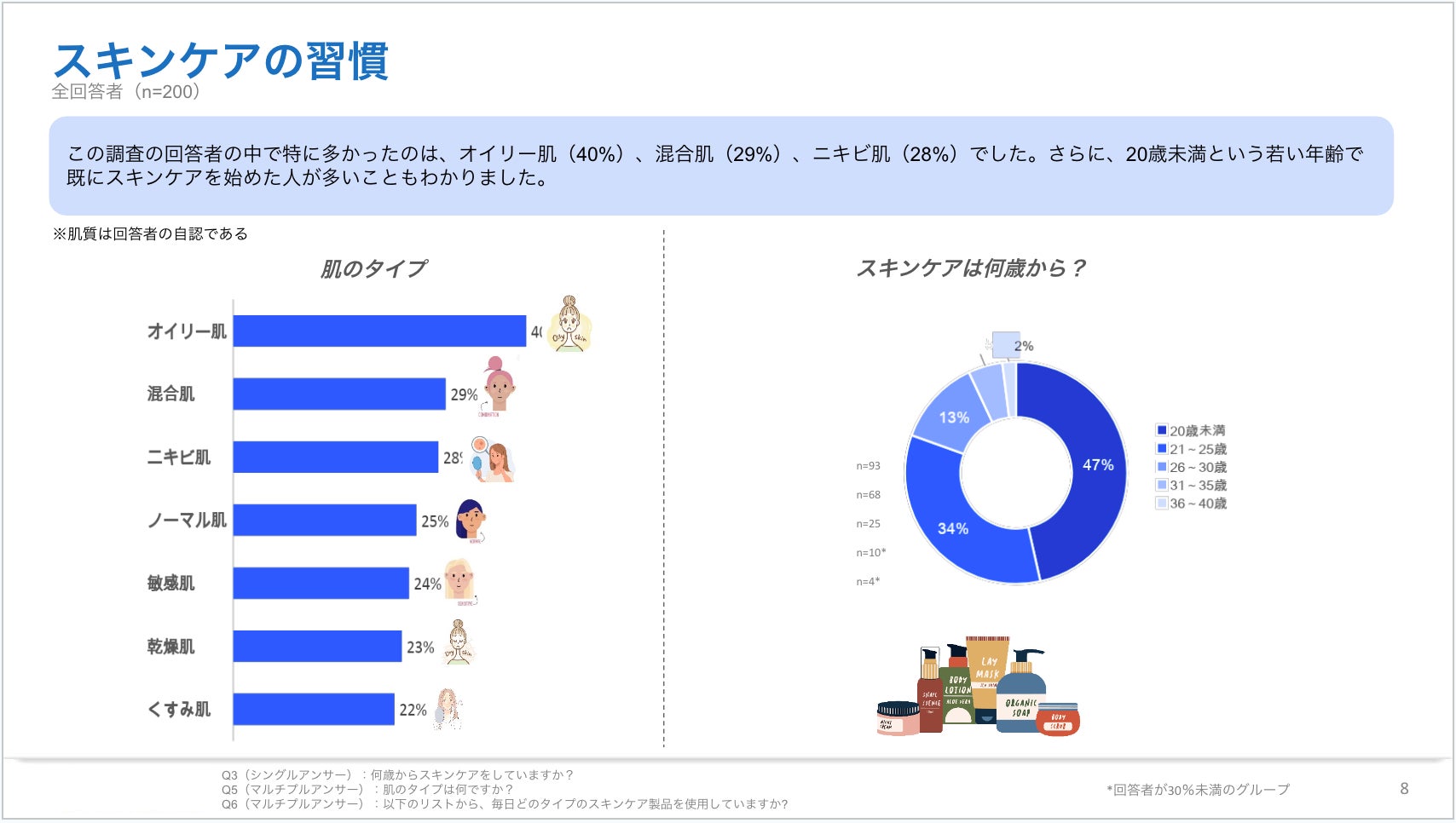 スキンケアを20歳未満から始める人(47%)、20〜25歳から始める人(34%)、26〜30歳から始める人が(13%)でした。また、回答者が自認する肌タイプはオイリー肌(40%)、混合肌(29%)、ニキビ肌(21%)が多い結果となりました。