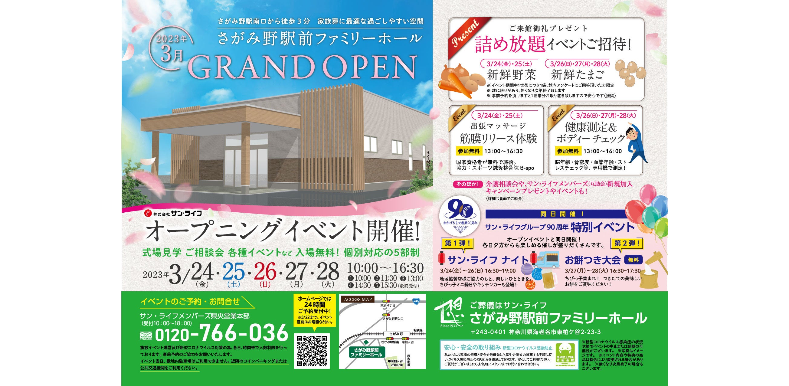 冠婚葬祭事業を運営する株式会社サン・ライフホールディング(神奈川県平塚市、代表取締役社長:比企武、以下「当社」)は、2023年3月24日(金)神奈川県海老名市に家族葬式場「さがみ野駅前ファミリーホール」をオープンいたします。